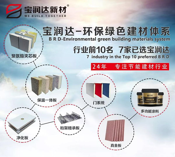 寶潤達自成立以來,以綠色、環保、節能為核心,專注于綠色節能環保建材產品的研發,寶潤達自主研發出聚氨酯節能板材外墻保溫裝飾一體板鋼筋桁架樓承板無菌凈化板多功能性環保涂料等全球最新主流綠色環保節能建筑裝飾用品、系統集成品,助推環保節能事業的建設發展。